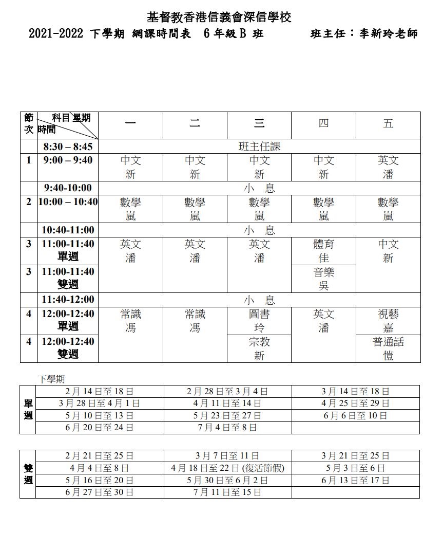 2021-2022_下學期_網課時間表_6B
