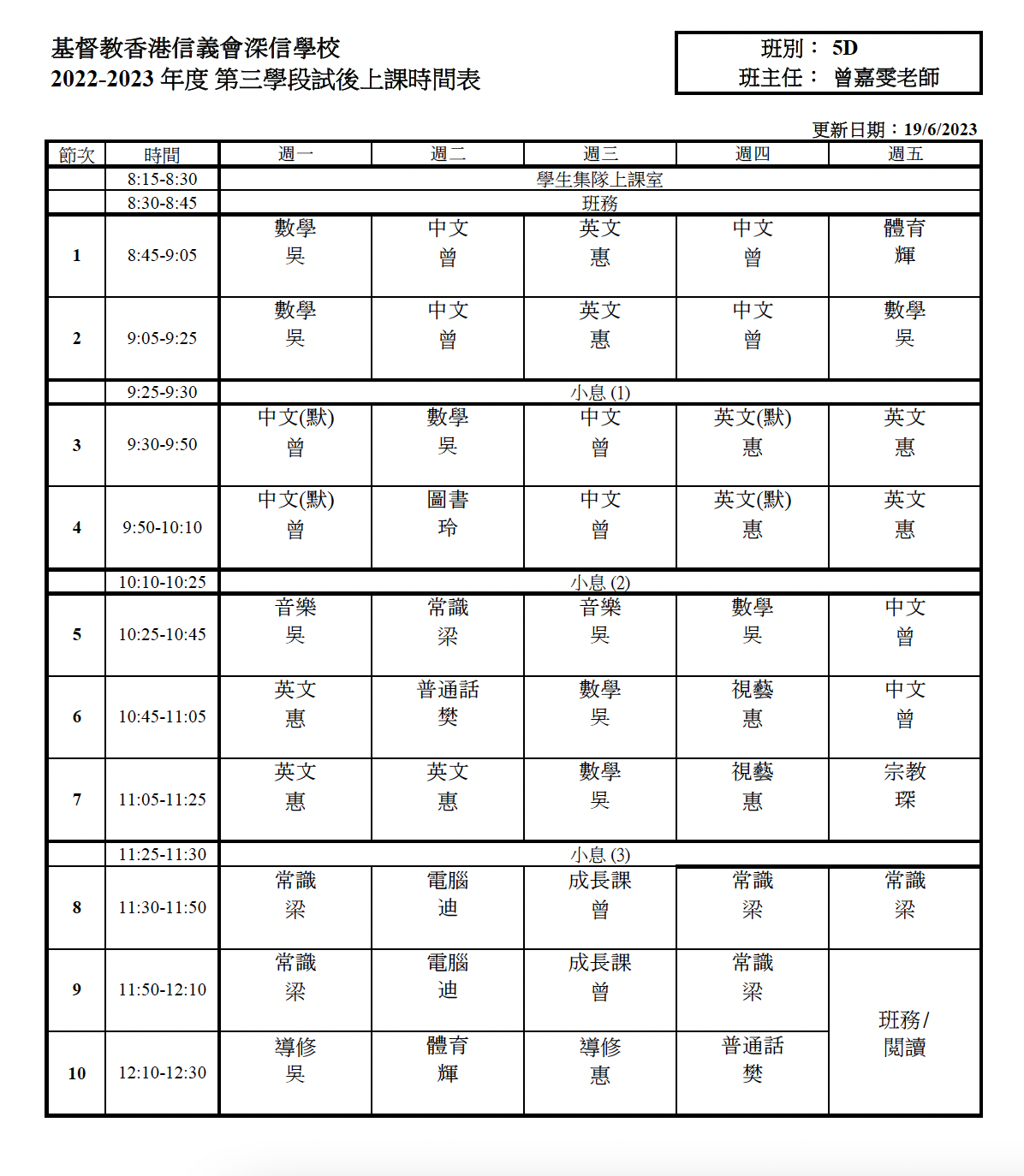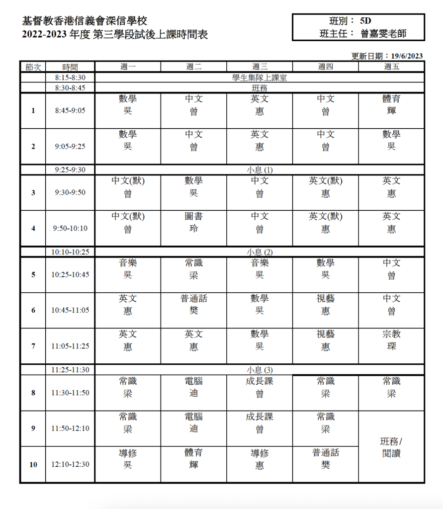 上課時間表